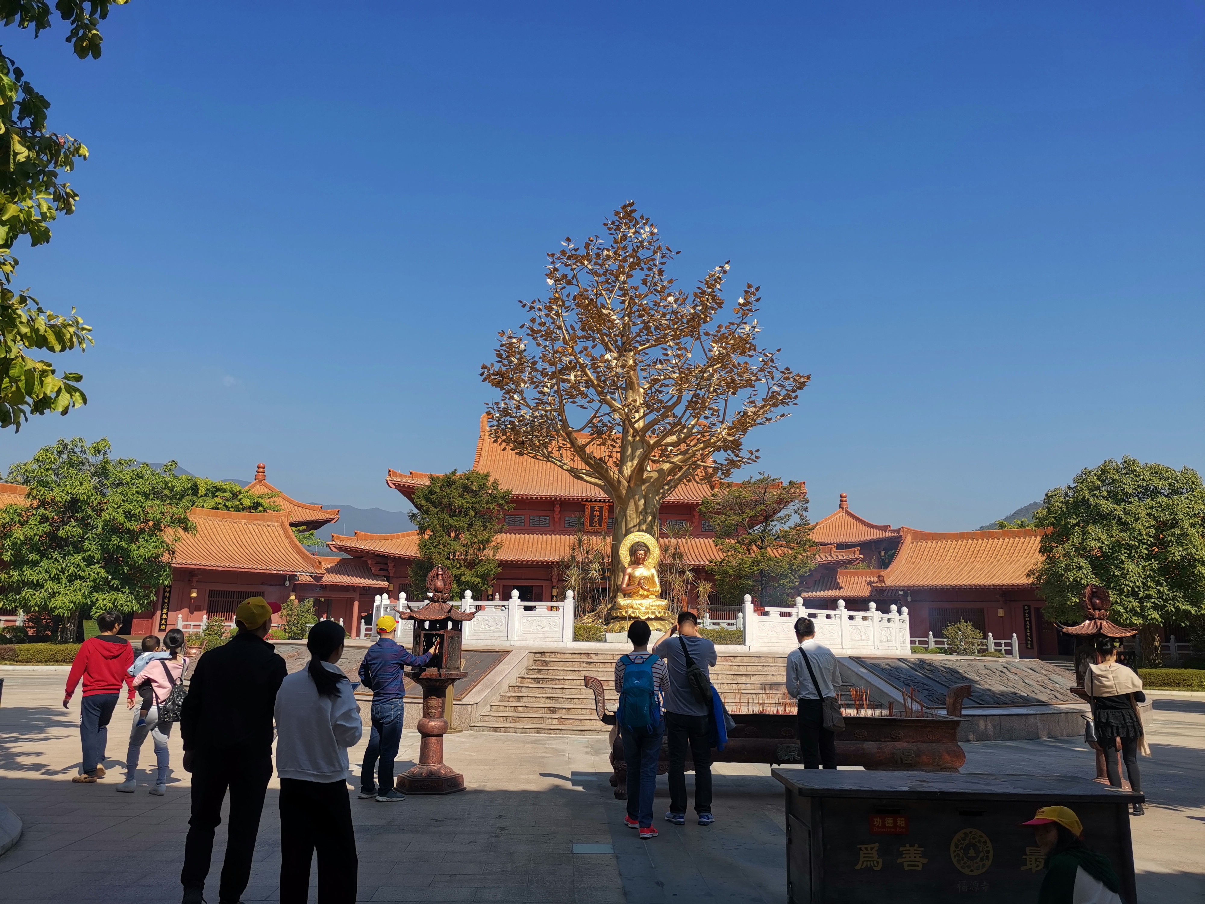 秋游河源的第一站是河源巴伐利亞莊園旁邊的福源寺,福源寺內(nèi)有一棵菩提樹,運用18噸仿金銅鑄而成,是世間首座戶外金菩堤圣樹,全樹4800片金葉子枝繁葉茂,冠蓋如云,放異光明。
